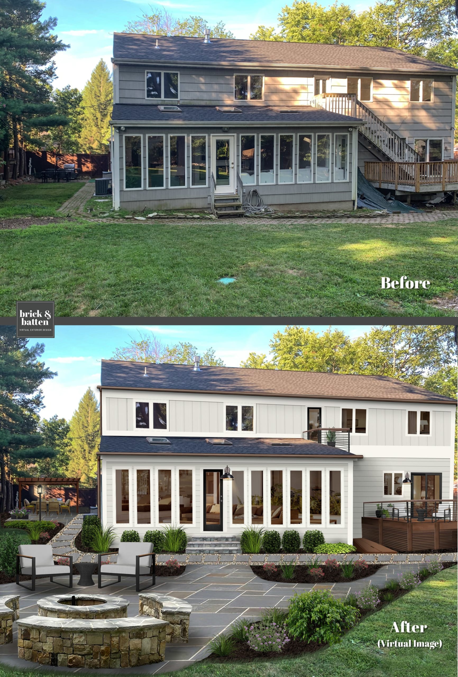 When choosing exterior paint for the front of your house, don’t forget to consider its impact on the back of your home. Notice how the darker paint in this before and after example instantly updates the home. To lean into the look even further, our virtual exterior designers recommend metal or cable railing.